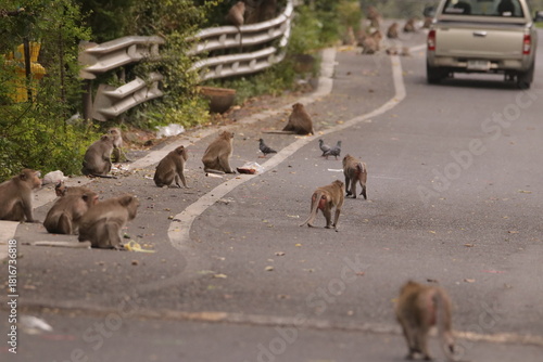 © rokacaptain, Fototapeta premium 태국 방센 카오삼묵 원숭이산에서 만난...아스팔트 도로위에서 구걸하는 느낌 원숭이들의 다양한 행동패턴, 표정, 눈짓, 상호관계,