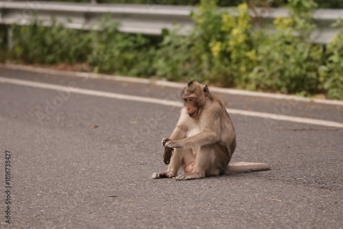 © rokacaptain, Fototapeta premium 태국 방센 카오삼묵 원숭이산에서 만난...아스팔트 도로위에서 구걸하는 느낌 원숭이들의 다양한 행동패턴, 표정, 눈짓, 상호관계,