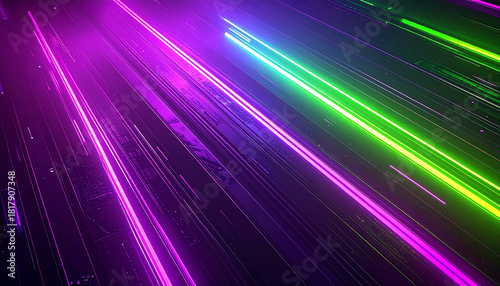 © LuckyStride, Fototapeta premium マゼンタから緑へ斜めに流れるネオン光線の宇宙空間背景