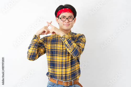 © siro46, Fototapeta premium アキバ系の男性 指でばつ印のジェスチャー 白背景