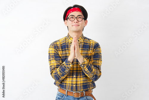Fototapeta premium アキバ系の男性 合掌して祈る 白背景