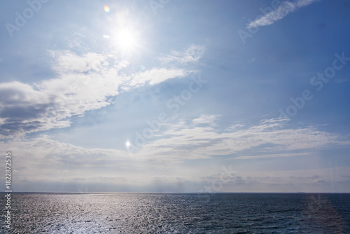 Obraz premium 片瀬白田の海岸線。沖に伊豆諸島が見えている。 伊豆半島の海岸線を走る列車、伊豆急行線の車窓からの風景 静岡県伊豆半島、伊豆急行線車内 - 2025年