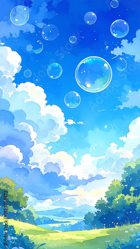 Fototapeta premium 公園の青空に浮かぶシャボン玉の水彩画風イラスト