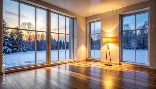 Obraz premium 冷たい霜の窓を背景に、柔らかなランプの灯りが木の面に穏やかな影を落とすミニマルな冬の室内です。...