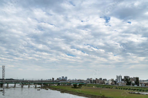 © onotorono, Obraz premium 秋の多摩川 雲の多い空