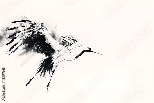 © A-photos, Fototapeta premium 大きく翼を広げて飛ぶ鶴を柔らかな筆致で描いた構図
