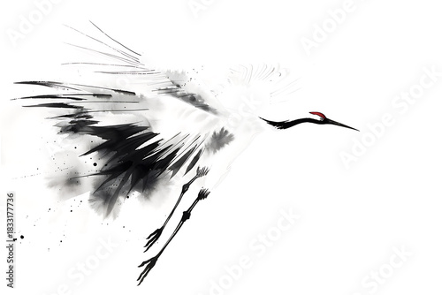 © A-photos, Fototapeta premium 大きく翼を広げて飛ぶ鶴を柔らかな筆致で描いた構図