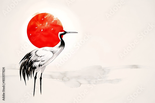Fototapeta premium 赤い太陽を背に立つ鶴の美しい佇まいを描いた構図
