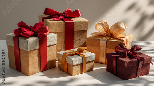 © Stock Bloom, Obraz premium 赤とゴールドのリボンが映える上品なギフトボックスのクリスマス構図・ミニマルホリデー背景