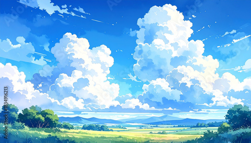 © Akio Mic, Fototapeta premium 入道雲が浮かぶ夏の山の風景 オーガニックな水彩画風