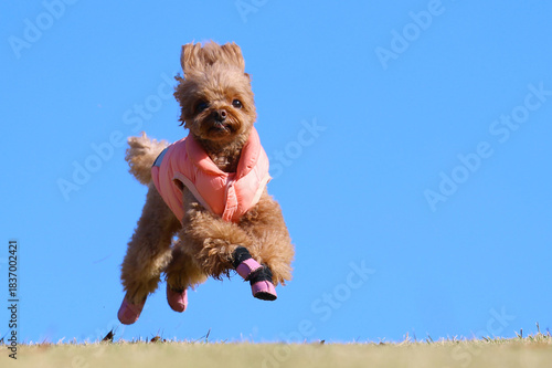 © ぬいぐるみ王国, Fototapeta premium 晴天に恵まれた下り坂のドッグランで思いっきり走るトイ・プードル