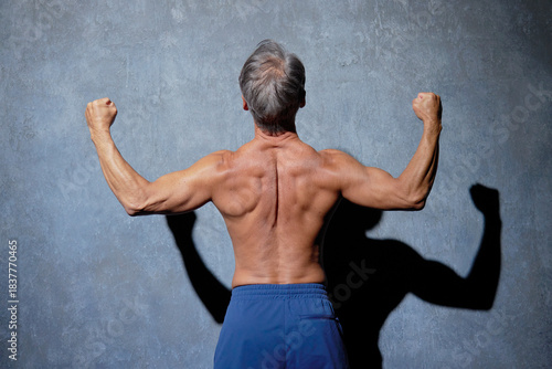 Obraz premium ポーズをとる筋肉のあるシニアの男性 後ろ姿