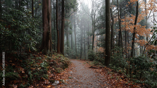 Obraz premium 朝霧に包まれた秋の森で、静かに続く散策路の景色