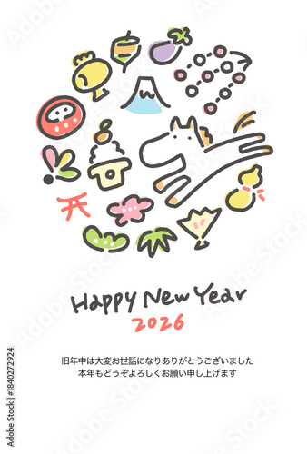 Fototapeta premium 白馬と正月のたくさんの縁起物のかわいい年賀状テンプレート 2026 縦型