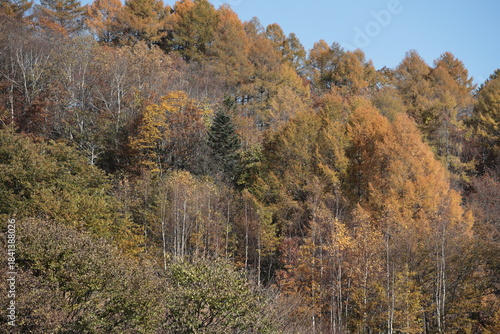 Fototapeta premium 広葉樹が落葉する頃、黄金色に色づき始めるカラマツ