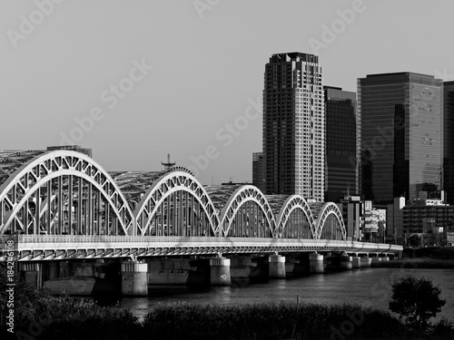 Obraz premium 十三大橋と大阪キタの街並み(モノクロ)