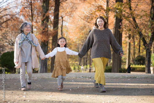© kapinon, Fototapeta premium 秋の公園で一緒に娘と手を繋ぐちょっと高齢のママと祖母(おばあちゃん)笑顔の正面全身
