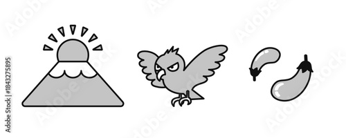 Obraz premium モノクロ線画の一富士二鷹三茄子 ベクターイラスト