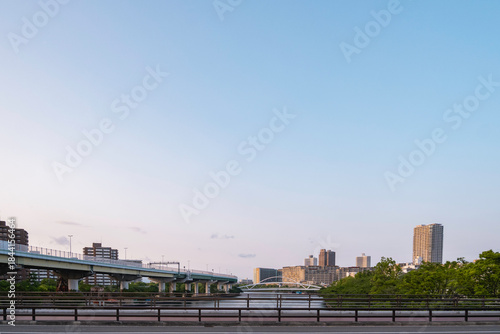Obraz premium 高速道路と河川、対岸の街並みのスカイライン