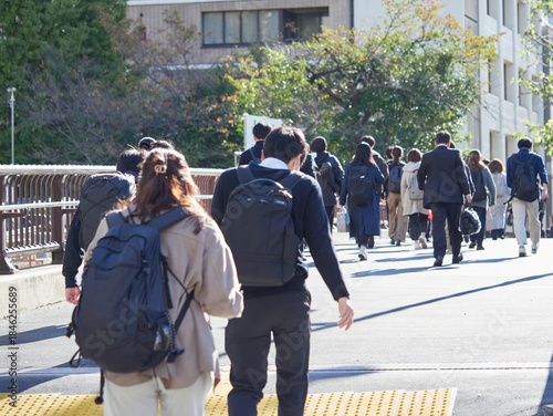Obraz premium 朝の通勤時間の東京都内のオフィス街で歩く大勢な通勤中の男女会社員の姿