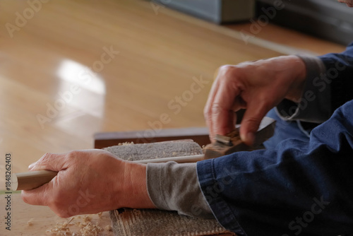 Obraz premium 日本刀の鞘をつくる鞘師の手元