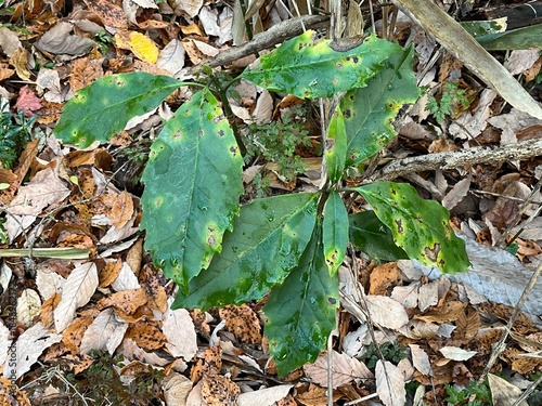 Naklejka premium 冬の林床で多く見かける、青々とした葉をもつアオキ。落
