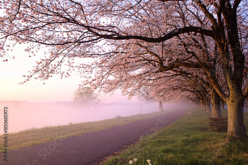 Obraz premium 宇都宮市 鬼怒川の石井桜堤と川霧