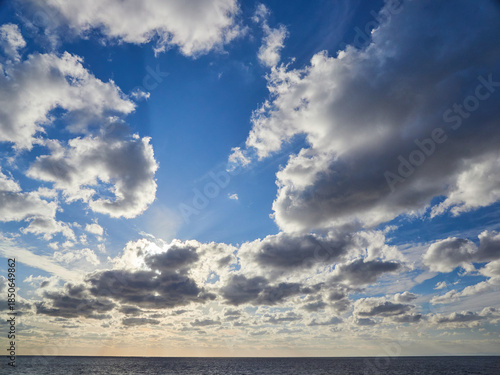 Obraz premium 秋の綺麗な青空と雲と海面の地平線の風景
