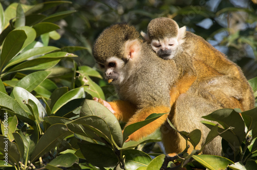 Obraz premium 親の背中で眠る小さなリスザル