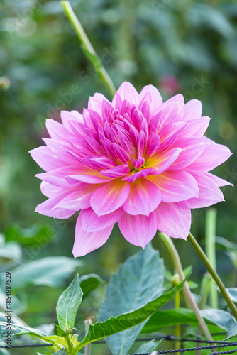 Obraz premium 庭に咲く大輪のピンクダリアと瑞々しい葉の風景