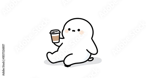 Fototapeta premium コーヒーカップを持ってリラックスする白いキャラクター