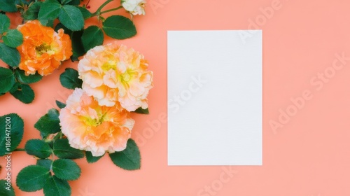 Obraz premium 花と白い紙が置かれたオレンジの背景