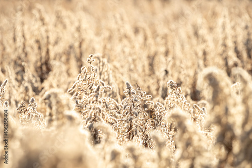 © officeU1, Fototapeta premium 冬の光に輝く枯れたセイタカアワダチソウの綿毛と冬枯れの野原