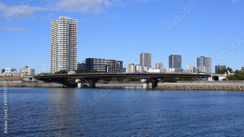 Fototapeta premium 検見川浜から見た美浜大橋と海浜幕張の風景
