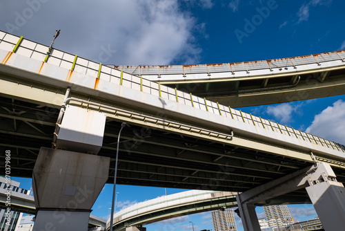 © Bhdr1996, Fototapeta premium 大阪、橋、城市、山、道路、風光、交通、青空、雲