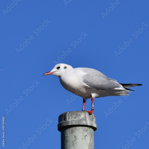 Obraz premium 青空、左足に青いカラーリングJEをつけたユリカモメ、千葉県市川市行徳鳥獣保護区