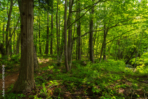 Obraz premium 日本の風景・初夏 長野県白馬村 新緑の木流川散策路