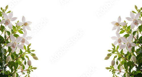 Fototapeta premium 白い花と緑の葉のシンプルなフレームデザイン