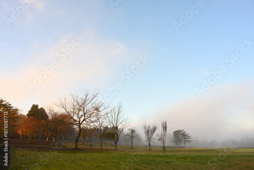 Obraz premium 山本山高原で見られる朝の紅葉風景(新潟県小千谷市)
