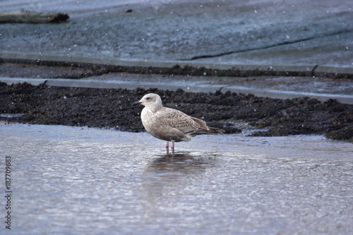 Obraz premium 雪の漁港に立つカモメの幼鳥
