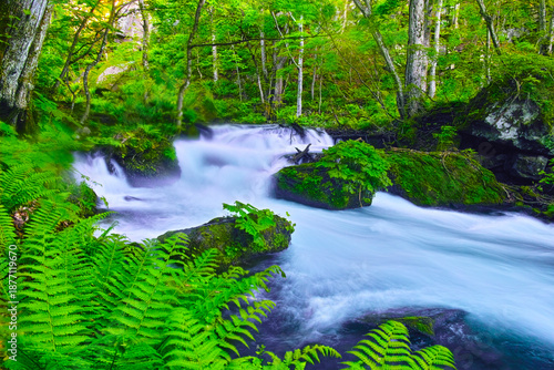 © 7maru, Obraz premium 青森県十和田市、新緑の奥入瀬渓谷の風景