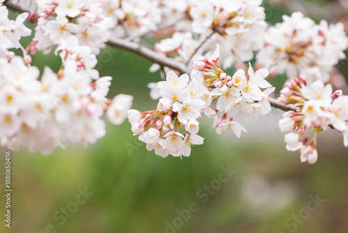 © viola, Fototapeta premium 春の日差しの中で5分咲きの桜の花 アップ ソメイヨシノの開花した花とつぼみ