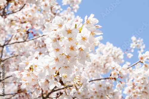 Obraz premium 青空と満開の桜の花 春の日差しの中で咲くソメイヨシノの桜の花