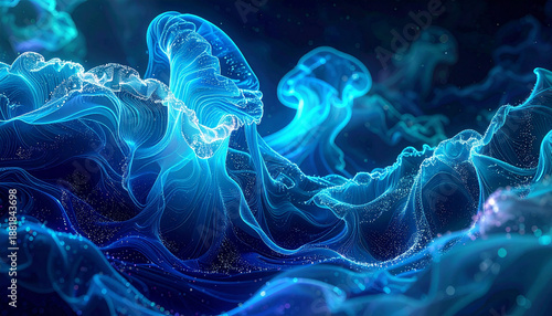 Obraz premium 透明感あふれる青いクラゲが優雅に泳ぐ深海の世界