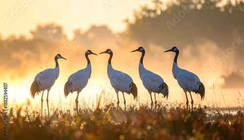 © tkc, Fototapeta premium 朝霧の湿原に立つ丹頂鶴