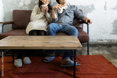 Naklejka premium テレビを見ながらコーヒーを飲む若い夫婦