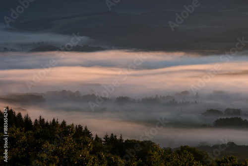 © oonoteruaki, Obraz premium 黒松内町の山からの眺望朝日に染まる雲海に覆われた農村風景