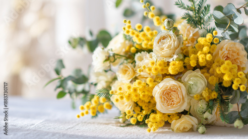© cassis, Naklejka premium 明るいイエローフラワー背景素材|ナチュラルで広告向きの春イメージ ミモザ&スプレーローズ
