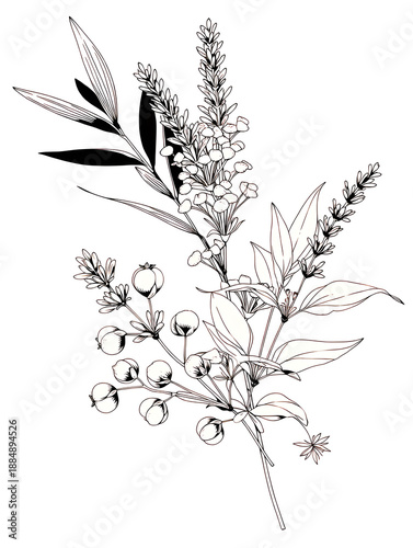 Obraz premium ユーカリとベリーのエレガントなボタニカル線画イラスト