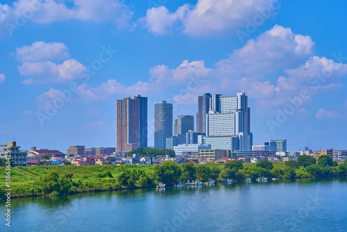 Fototapeta premium 夏の東京都大田区のガス橋から北西側の眺望(川崎市中丸子,下沼部,タワーマンション,多摩川の漁船など)